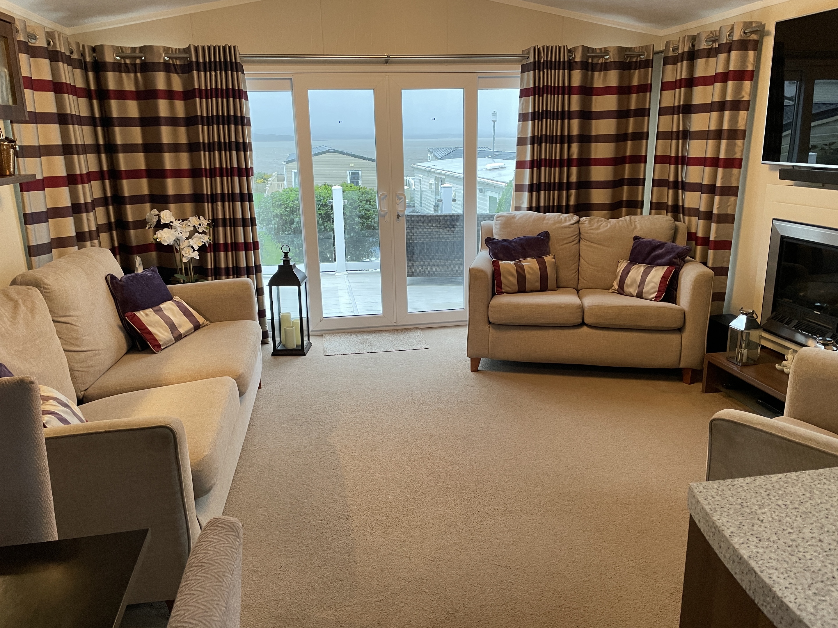 The kitchen has all the equipment you require for your holiday; cooker with grill, fridge/freezer, dishwasher, washing machine, microwave, toaster, juicer, kettle and cupboards together with a full range of cutlery, crockery, glasses and kitchen utensils. The lounge/diner is modern and light with free-standing furniture - the perfect place to relax and enjoy your break. There is a 50" flat-screen TV with sound bar, a Toshiba DVD, an electric fire, a dining table and six chairs. There is a wrap-around veranda where you can sit and enjoy the view from the garden furniture. There is also a table tennis table in the garden.