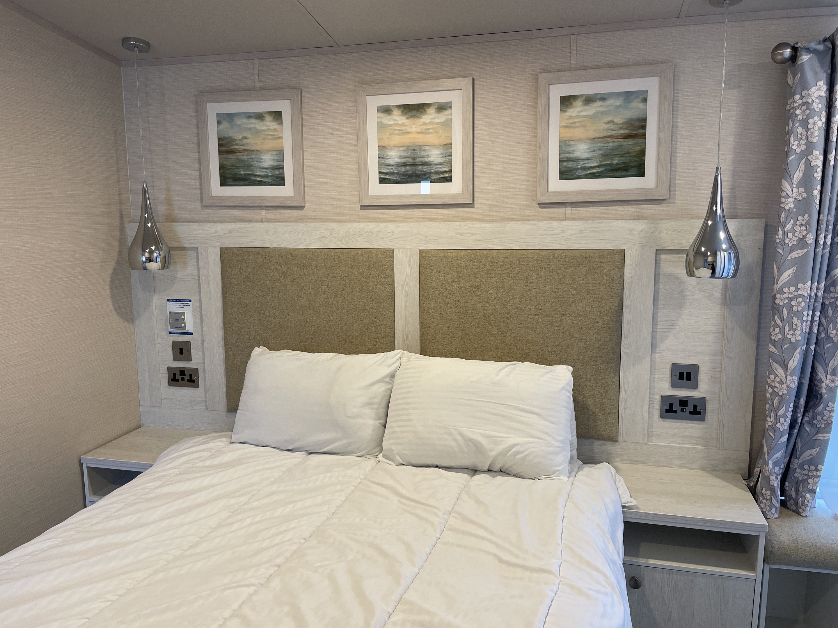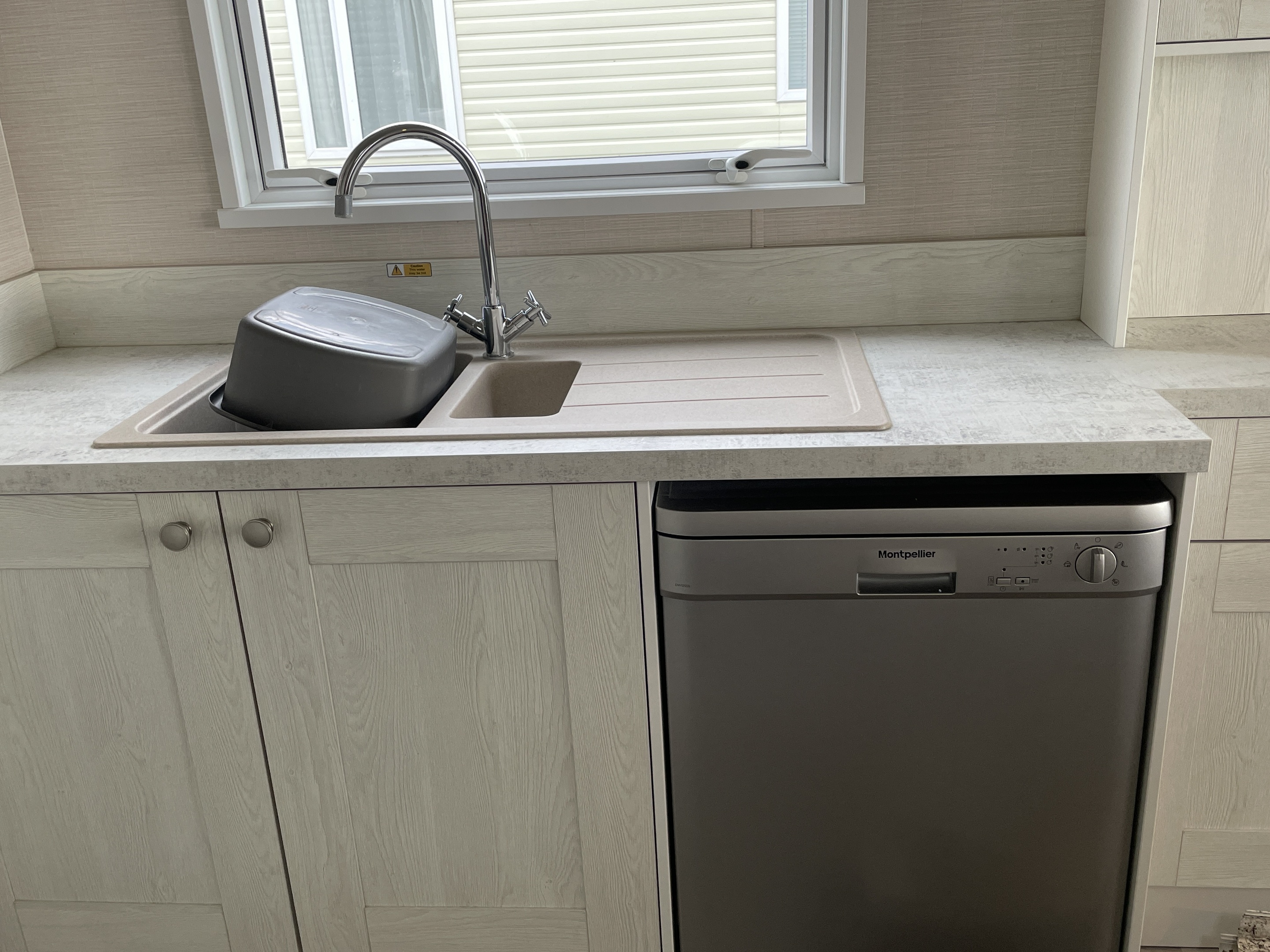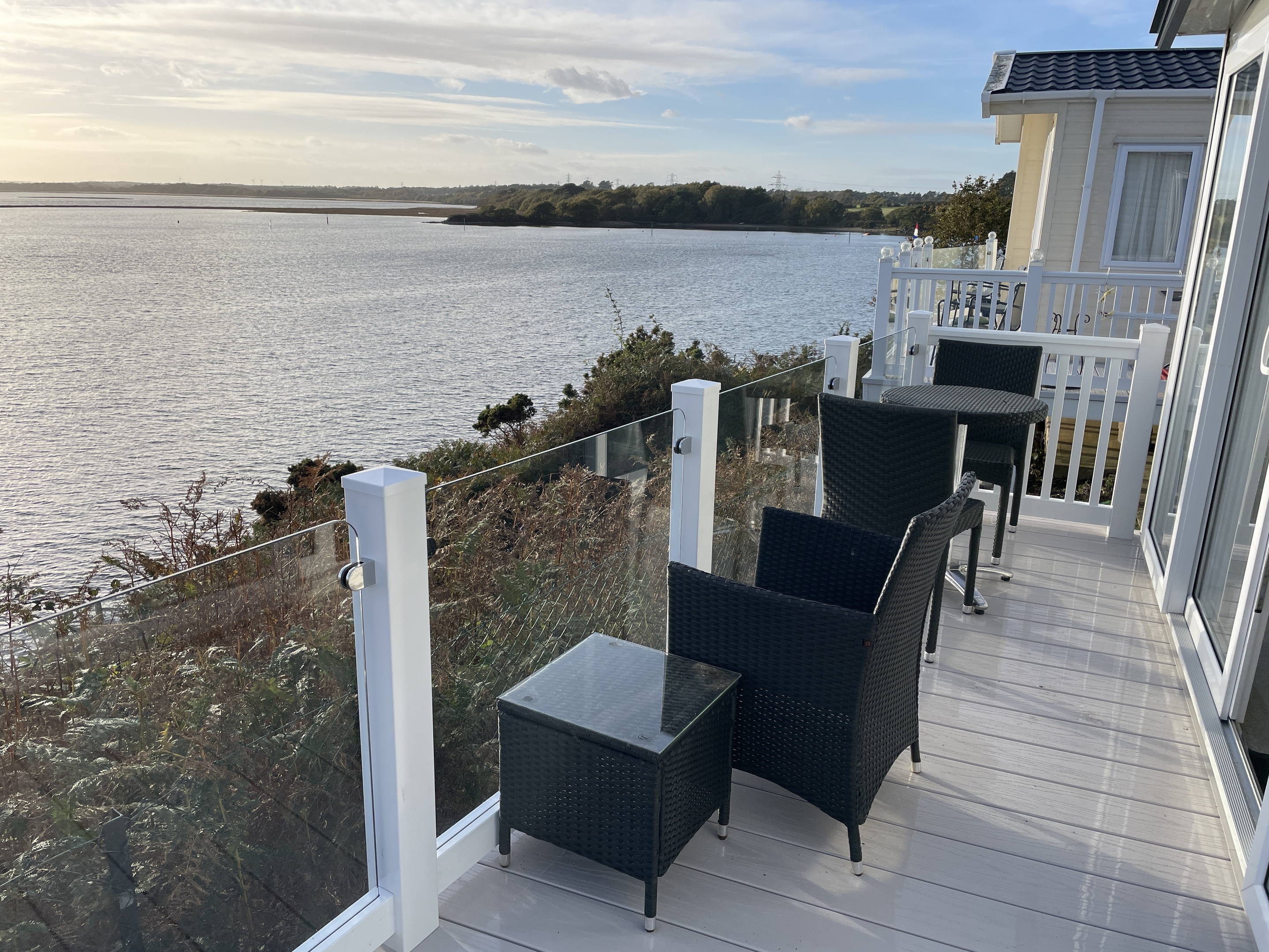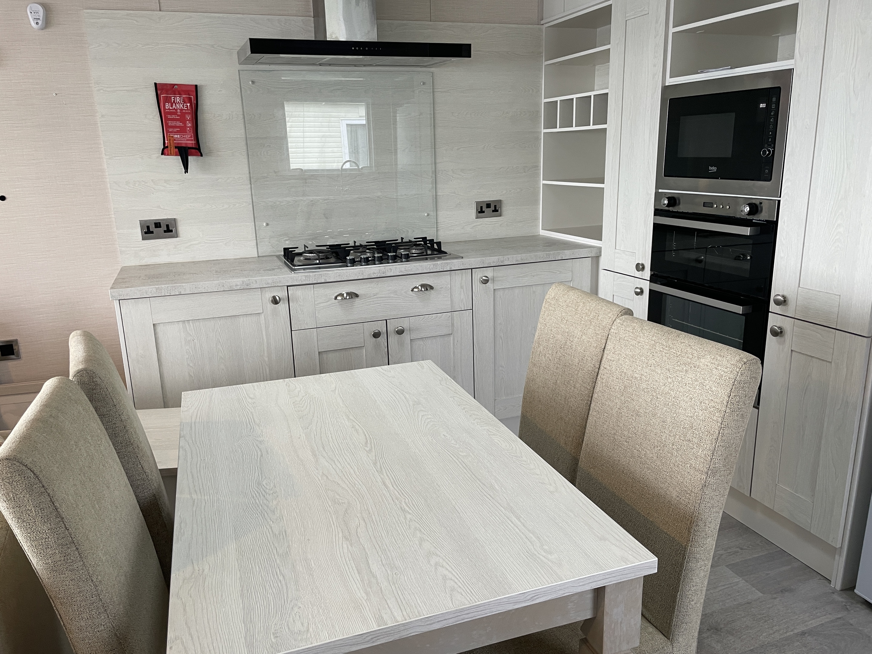 The kitchen has all the equipment you require for your holiday; cooker with grill, full-size dishwasher, washing machine, fridge/freezer, microwave, toaster, kettle and cupboards together with a full range of cutlery, crockery and kitchen utensils. The lounge/diner is modern and light with free-standing furniture. The perfect place to stretch out and look across the water. There is a flat-screen TV/DVD, a dining table and four chairs. The patio doors lead to the enclosed veranda with table and garden chairs.